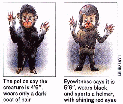 ![]() India's fortnight of reports on the Monkey Man have produced a wide variety of descriptions of a "creature" that some note jumps from roof to roof and looks like a bipedal hairy hominoid - or a human wearing a costume. Attached is the drawings released by the Indian Police overnight. I am working on a summary article on the whole flap, in conjunction with some associates familiar with a few specific Indian items which appear to be confusing Western readers of the "drama." |